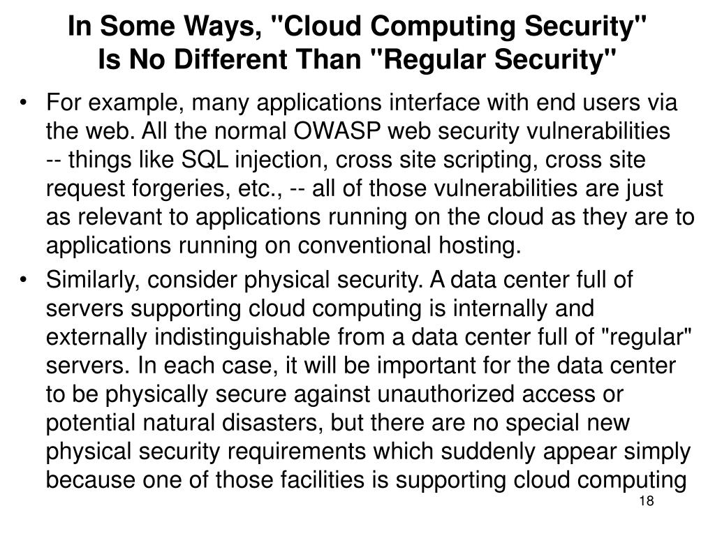 In Some Ways, "Cloud Computing Security"Is No Different Than "Regular Security" • For example, many applications interface with end users via the web. All the normal OWASP web security vulnerabilities -- things like SQL injection, cross site scripting, cross site request forgeries, etc., -- all of those vulnerabilities are just as relevant to applications running on the cloud as they are to applications running on conventional hosting. • Similarly, consider physical security. A data center full of servers supporting cloud computing is internally and externally indistinguishable from a data center full of "regular" servers. In each case, it will be important for the data center to be physically secure against unauthorized access or potential natural disasters, but there are no special new physical security requirements which suddenly appear simply because one of those facilities is supporting cloud computing