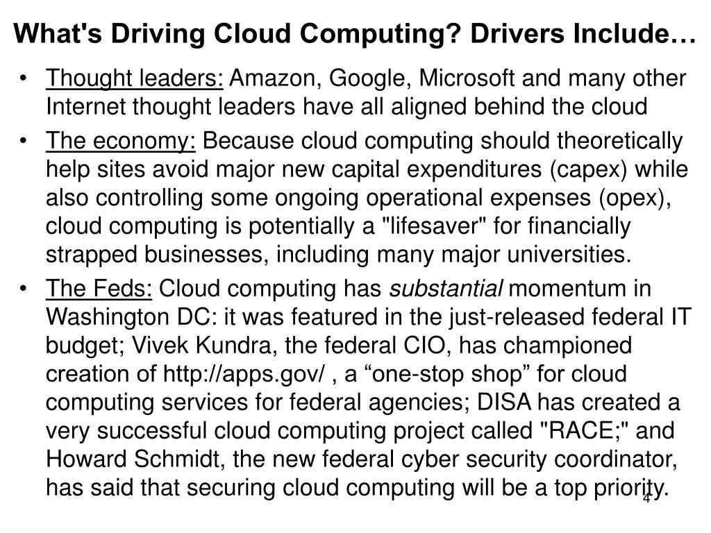 What's Driving Cloud Computing? Drivers Include… • Thought leaders: Amazon, Google, Microsoft and many other Internet thought leaders have all aligned behind the cloud • The economy: Because cloud computing should theoretically help sites avoid major new capital expenditures (capex) while also controlling some ongoing operational expenses (opex), cloud computing is potentially a "lifesaver" for financially strapped businesses, including many major universities. • The Feds: Cloud computing has substantial momentum in Washington DC: it was featured in the just-released federal IT budget; Vivek Kundra, the federal CIO, has championed creation of http://apps.gov/ , a “one-stop shop” for cloud computing services for federal agencies; DISA has created a very successful cloud computing project called "RACE;" and Howard Schmidt, the new federal cyber security coordinator, has said that securing cloud computing will be a top priority.