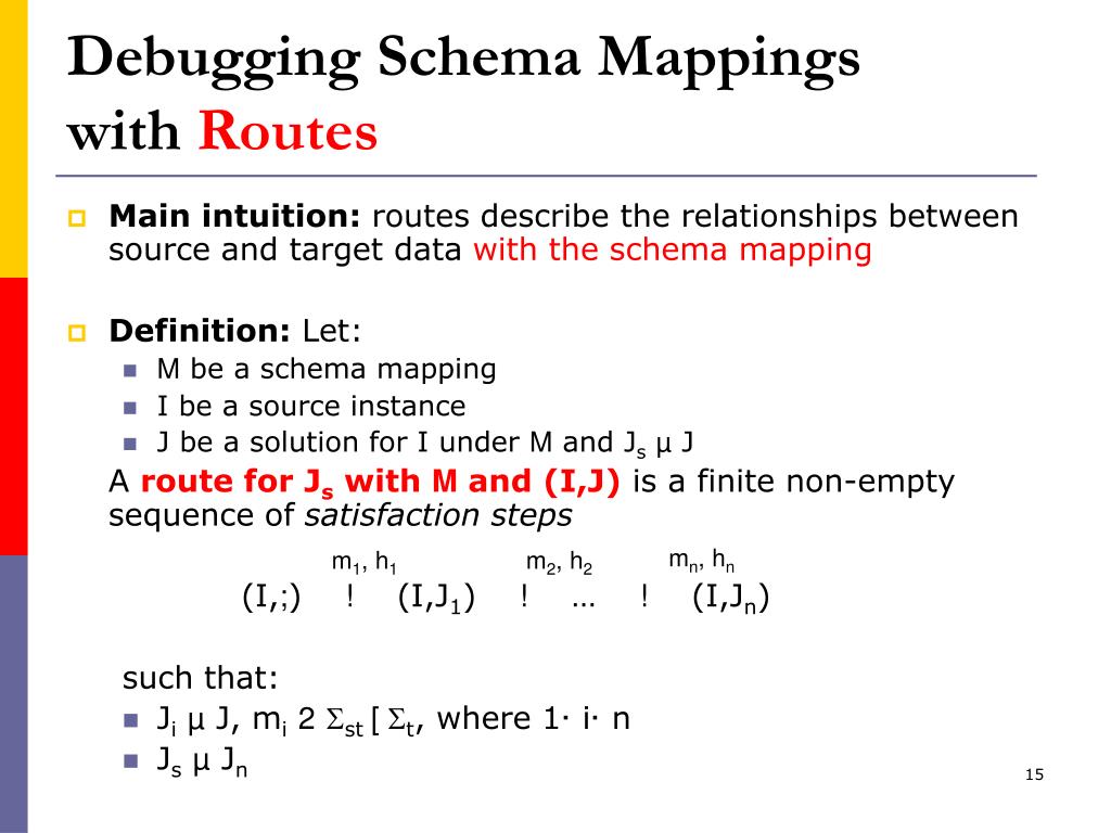 Debugging Schema Mappings with Routes • Main intuition: routes describe the relationships between source and target data with the schema mapping • Definition: Let: • M be a schema mapping • I be a source instance • J be a solution for I under M and Jsµ J A route for Js with M and (I,J) is a finite non-empty sequence of satisfaction steps (I,;) ! (I,J1) ! … ! (I,Jn) such that: • Jiµ J, mi2st [ t, where 1· i· n • Jsµ Jn mn, hn m1, h1 m2, h2