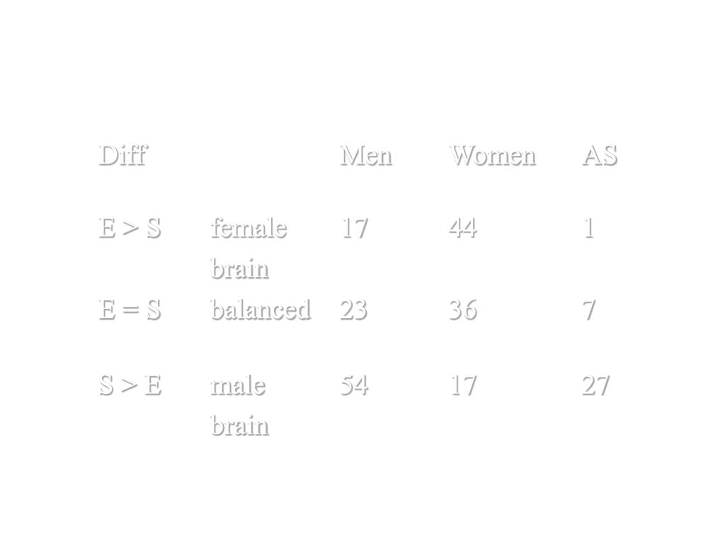 The Systemizing Quotient (SQ)(max = 80) mean sd Males 30.3 11.7 Females 24.1 9.5 AS 35.9 15.2 BC et al (2003) Proc Royal Soc