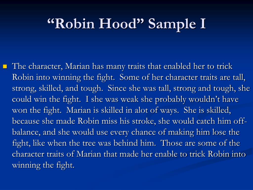 “Robin Hood” Sample I • The character, Marian has many traits that enabled her to trick Robin into winning the fight. Some of her character traits are tall, strong, skilled, and tough. Since she was tall, strong and tough, she could win the fight. I she was weak she probably wouldn’t have won the fight. Marian is skilled in alot of ways. She is skilled, because she made Robin miss his stroke, she would catch him off-balance, and she would use every chance of making him lose the fight, like when the tree was behind him. Those are some of the character traits of Marian that made her enable to trick Robin into winning the fight.