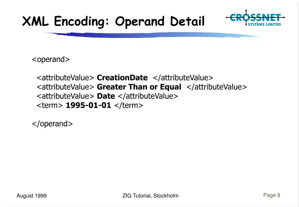 XML Encoding: Operand Detail <operand> <attributeValue> CreationDate </attributeValue> <attributeValue> Greater Than or Equal </attributeValue> <attributeValue> Date </attributeValue> <term> 1995-01-01 </term></operand>