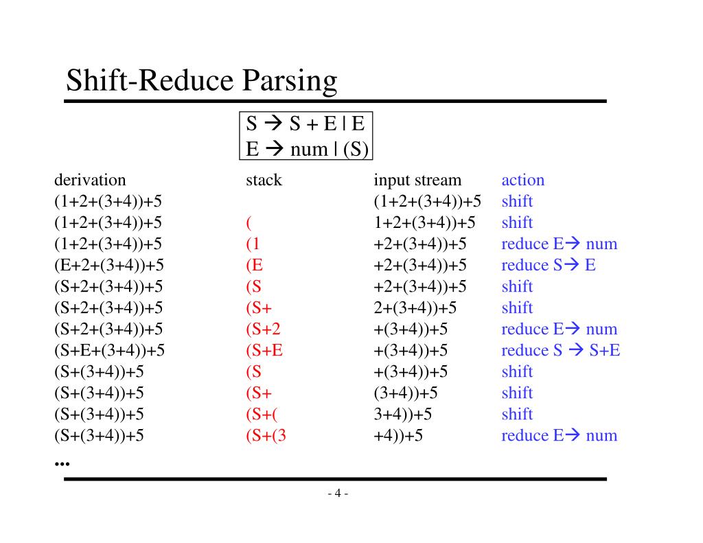 Shift-Reduce Parsing S S + E | E E num | (S) derivation stack input stream action (1+2+(3+4))+5 (1+2+(3+4))+5 shift (1+2+(3+4))+5 ( 1+2+(3+4))+5 shift (1+2+(3+4))+5 (1 +2+(3+4))+5 reduce E num (E+2+(3+4))+5 (E +2+(3+4))+5 reduce S E (S+2+(3+4))+5 (S +2+(3+4))+5 shift (S+2+(3+4))+5 (S+ 2+(3+4))+5 shift (S+2+(3+4))+5 (S+2 +(3+4))+5 reduce E num (S+E+(3+4))+5 (S+E +(3+4))+5 reduce S S+E (S+(3+4))+5 (S +(3+4))+5 shift (S+(3+4))+5 (S+ (3+4))+5 shift (S+(3+4))+5 (S+( 3+4))+5 shift (S+(3+4))+5 (S+(3 +4))+5 reduce E num ...