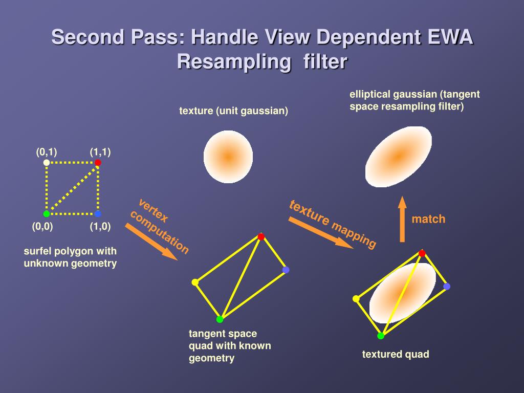 elliptical gaussian (tangent space resampling filter) texture (unit gaussian) (0,1) (1,1) match (0,0) (1,0) texturemapping surfel polygon with unknown geometry tangent space quad with known geometry vertex computation textured quad Second Pass: Handle View Dependent EWA Resampling filter