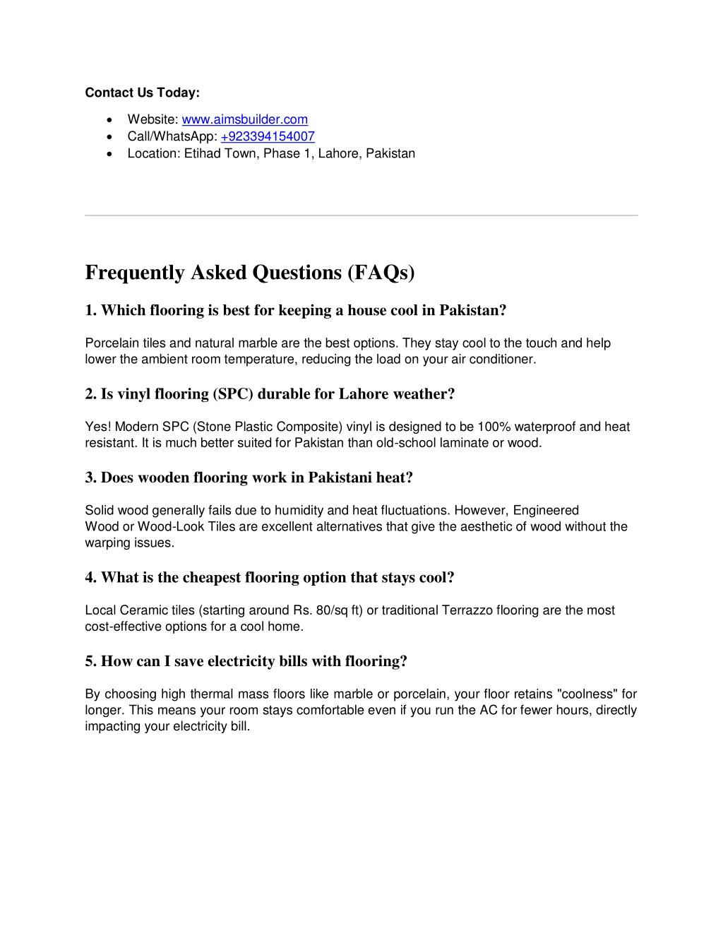 Contact Us Today: Website: www.aimsbuilder.com Call/WhatsApp: +923394154007 Location: Etihad Town, Phase 1, Lahore, Pakistan Frequently Asked Questions (FAQs) 1. Which flooring is best for keeping a house cool in Pakistan? Porcelain tiles and natural marble are the best options. They stay cool to the touch and help lower the ambient room temperature, reducing the load on your air conditioner. 2. Is vinyl flooring (SPC) durable for Lahore weather? Yes! Modern SPC (Stone Plastic Composite) vinyl is designed to be 100% waterproof and heat resistant. It is much better suited for Pakistan than old-school laminate or wood. 3. Does wooden flooring work in Pakistani heat? Solid wood generally fails due to humidity and heat fluctuations. However, Engineered Wood or Wood-Look Tiles are excellent alternatives that give the aesthetic of wood without the warping issues. 4. What is the cheapest flooring option that stays cool? Local Ceramic tiles (starting around Rs. 80/sq ft) or traditional Terrazzo flooring are the most cost-effective options for a cool home. 5. How can I save electricity bills with flooring? By choosing high thermal mass floors like marble or porcelain, your floor retains "coolness" for longer. This means your room stays comfortable even if you run the AC for fewer hours, directly impacting your electricity bill.