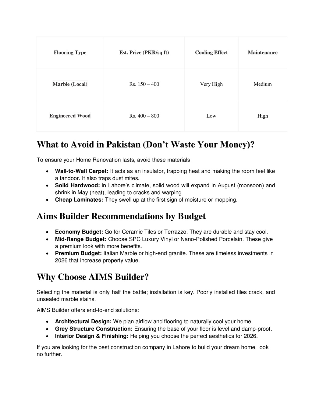 Flooring Type Est. Price (PKR/sq ft) Cooling Effect Maintenance Marble (Local) Rs. 150 – 400 Very High Medium Engineered Wood Rs. 400 – 800 Low High What to Avoid in Pakistan (Don’t Waste Your Money)? To ensure your Home Renovation lasts, avoid these materials: Wall-to-Wall Carpet: It acts as an insulator, trapping heat and making the room feel like a tandoor. It also traps dust mites. Solid Hardwood:In Lahore’s climate, solid wood will expand in August (monsoon) and shrink in May (heat), leading to cracks and warping. Cheap Laminates: They swell up at the first sign of moisture or mopping. Aims Builder Recommendations by Budget Economy Budget: Go for Ceramic Tiles or Terrazzo. They are durable and stay cool. Mid-Range Budget: Choose SPC Luxury Vinyl or Nano-Polished Porcelain. These give a premium look with more benefits. Premium Budget: Italian Marble or high-end granite. These are timeless investments in 2026 that increase property value. Why Choose AIMS Builder? Selecting the material is only half the battle; installation is key. Poorly installed tiles crack, and unsealed marble stains. AIMS Builder offers end-to-end solutions: Architectural Design: We plan airflow and flooring to naturally cool your home. Grey Structure Construction: Ensuring the base of your floor is level and damp-proof. Interior Design & Finishing: Helping you choose the perfect aesthetics for 2026. If you are looking for the best construction company in Lahore to build your dream home, look no further.