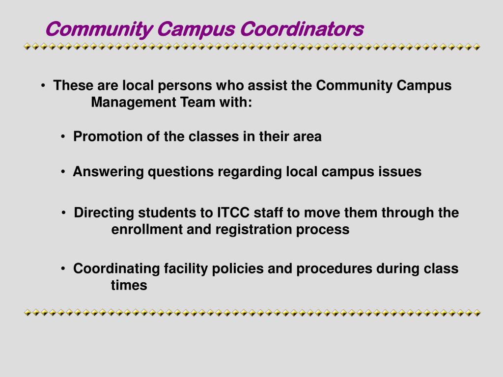 Community Campus Coordinators • These are local persons who assist the Community Campus Management Team with: • Promotion of the classes in their area • Answering questions regarding local campus issues • Directing students to ITCC staff to move them through the enrollment and registration process • Coordinating facility policies and procedures during class times