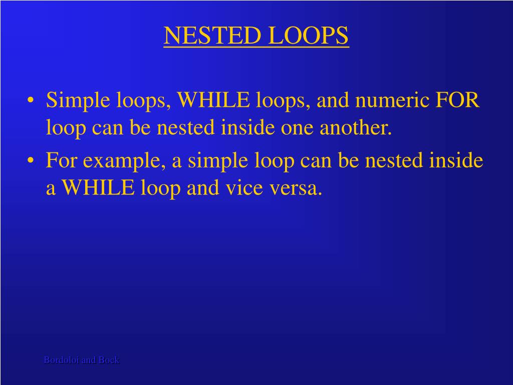 NESTED LOOPS • Simple loops, WHILE loops, and numeric FOR loop can be nested inside one another. • For example, a simple loop can be nested inside a WHILE loop and vice versa.