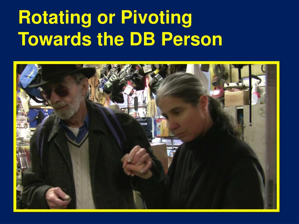 Turning Around • In the previous slide the SSP-Guide pivoted towards the DB person so that she does most of the moving. He merely pivots in place while she takes the few steps to turn around. Thus she can watch where she steps, objects on the shelves etc. in this narrow space. • In the next slide she walks at an angle to make herself narrow.