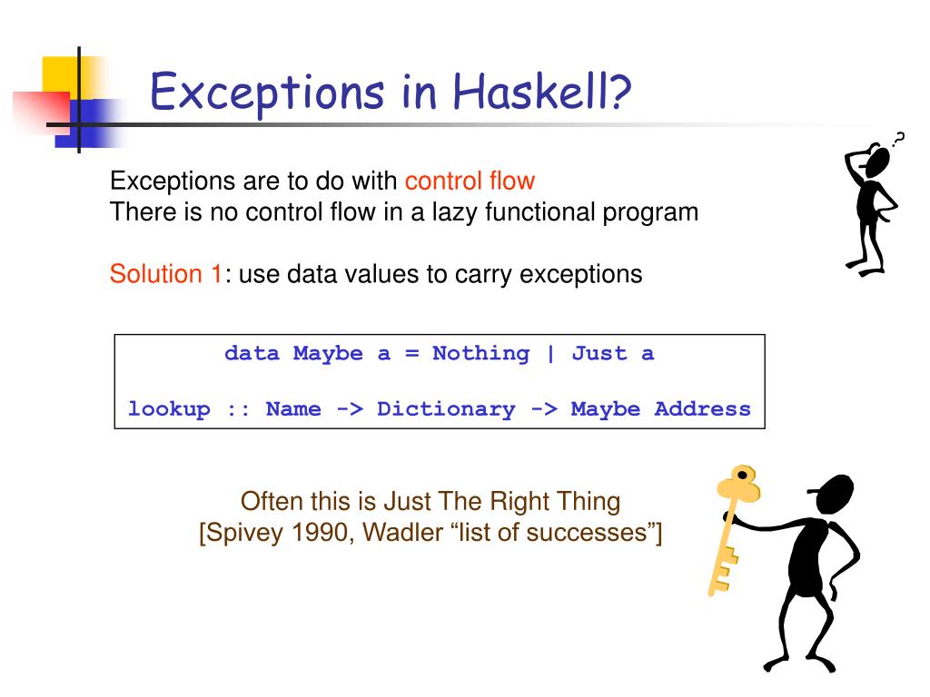 Exceptions in Haskell? Exceptions are to do with control flow There is no control flow in a lazy functional program Solution 1: use data values to carry exceptions data Maybe a = Nothing | Just a lookup :: Name -> Dictionary -> Maybe Address Often this is Just The Right Thing [Spivey 1990, Wadler “list of successes”]