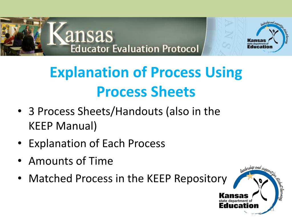 Explanation of Process Using Process Sheets • 3 Process Sheets/Handouts (also in the KEEP Manual) • Explanation of Each Process • Amounts of Time • Matched Process in the KEEP Repository