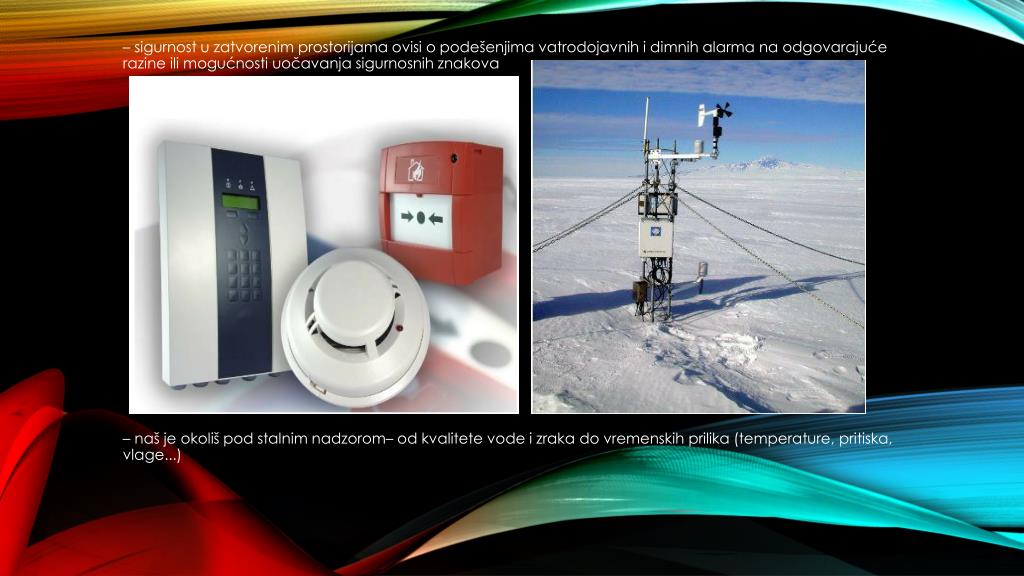 – sigurnost u zatvorenimprostorijamaovisi o podešenjimavatrodojavnihidimnihalarmanaodgovarajućerazineilimogućnostiuočavanjasigurnosnihznakova – naš je okoliš pod stalnimnadzorom– od kvalitetevodeizraka do vremenskihprilika (temperature, pritiska, vlage...)
