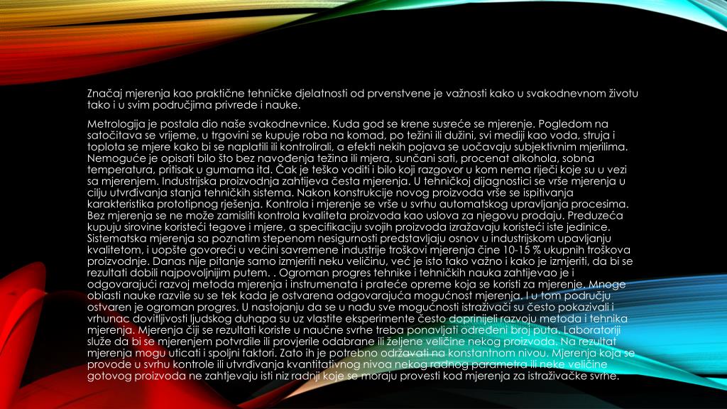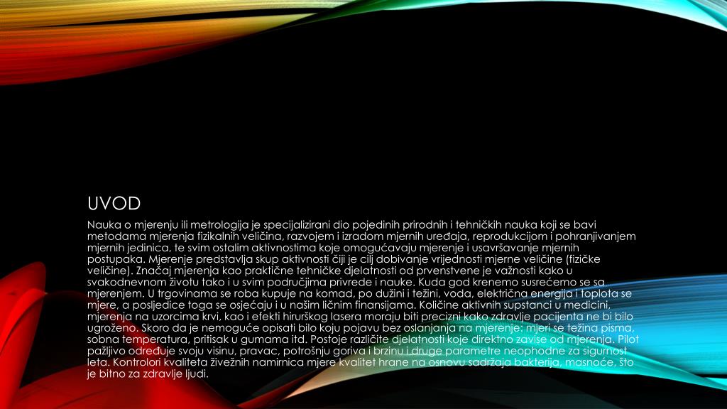 UVOD Nauka o mjerenjuilimetrologija je specijaliziranidiopojedinihprirodnihitehničkihnaukakoji se bavimetodamamjerenjafizikalnihveličina, razvojemiizradommjernihuređaja, reprodukcijomipohranjivanjemmjernihjedinica, tesvimostalimaktivnostimakojeomogućavajumjerenjeiusavršavanjemjernihpostupaka. Mjerenjepredstavljaskupaktivnostičiji je ciljdobivanjevrijednostimjerneveličine (fizičkeveličine). Značajmjerenjakaopraktičnetehničkedjelatnosti od prvenstvene je važnostikako u svakodnevnomživotutakoi u svimpodručjimaprivredeinauke. Kuda god krenemosusrećemo se samjerenjem. U trgovinama se robakupujenakomad, podužiniitežini, voda, električnaenergijaitoplota se mjere, a posljedice toga se osjećajui u našimličnimfinansijama. Količineaktivnihsupstanci u medicini, mjerenjanauzorcimakrvi, kaoiefektihirurškoglaseramorajubitipreciznikakozdravljepacijenta ne bi bilougroženo. Skoro da je nemogućeopisatibilokojupojavubezoslanjanjanamjerenje: mjeri se težinapisma, sobnatemperatura, pritisak u gumamaitd. Postojerazličitedjelatnostikojedirektnozavise od mjerenja. Pilot pažljivoodređujesvojuvisinu, pravac, potrošnjugorivaibrzinuidrugeparametreneophodnezasigurnostleta. Kontrolorikvalitetaživežnihnamirnicamjerekvalitethranenaosnovusadržajabakterija, masnoće, što je bitnozazdravljeljudi.