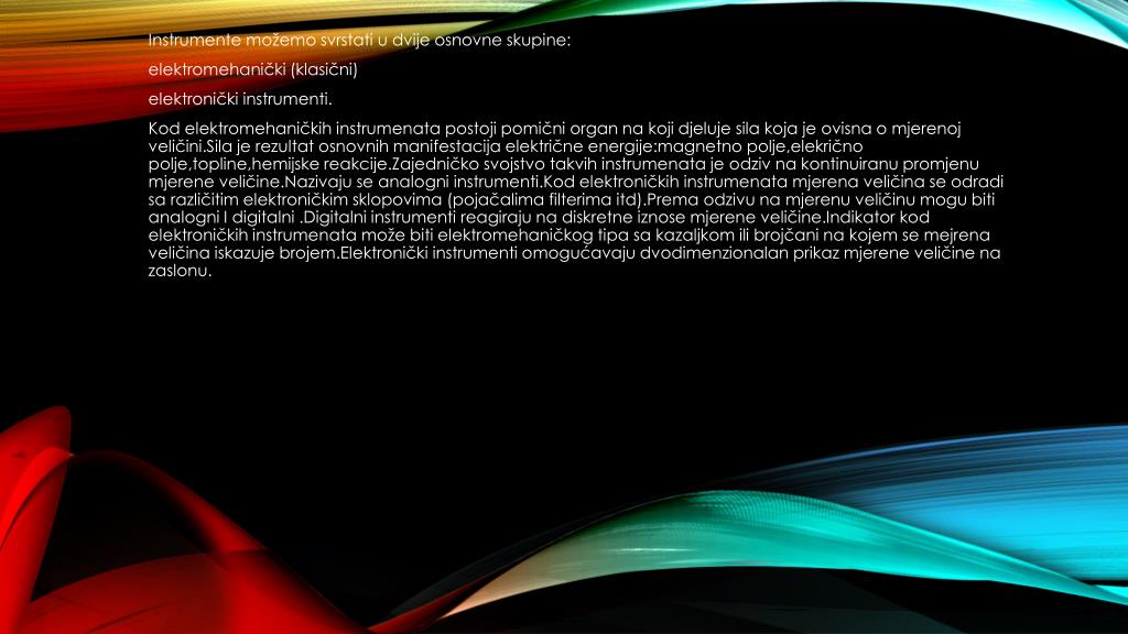 Instrumentemožemosvrstati u dvijeosnovneskupine: elektromehanički (klasični) elektroničkiinstrumenti. Kodelektromehaničkihinstrumenatapostojipomični organ nakojidjelujesilakoja je ovisna o mjerenojveličini.Sila je rezultatosnovnihmanifestacijaelektričneenergije:magnetnopolje,elekričnopolje,topline,hemijskereakcije.Zajedničkosvojstvotakvihinstrumenata je odzivnakontinuiranupromjenumjereneveličine.Nazivaju se analogniinstrumenti.Kodelektroničkihinstrumenatamjerenaveličina se odradisarazličitimelektroničkimsklopovima (pojačalimafilterimaitd).Premaodzivunamjerenuveličinumogubitianalogni I digitalni .Digitalniinstrumentireagirajunadiskretneiznosemjereneveličine.Indikatorkodelektroničkihinstrumenatamožebitielektromehaničkogtipasakazaljkomilibrojčaninakojem se mejrenaveličinaiskazujebrojem.Elektroničkiinstrumentiomogućavajudvodimenzionalanprikazmjereneveličinenazaslonu.