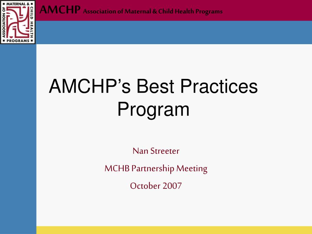 AMCHP’s Best Practices Program. Nan Streeter MCHB Partnership Meeting October 2007. AMCHP’s Best Practice Program. AMCHP launched the best practice program at the 2007 AMCHP Annual Conference