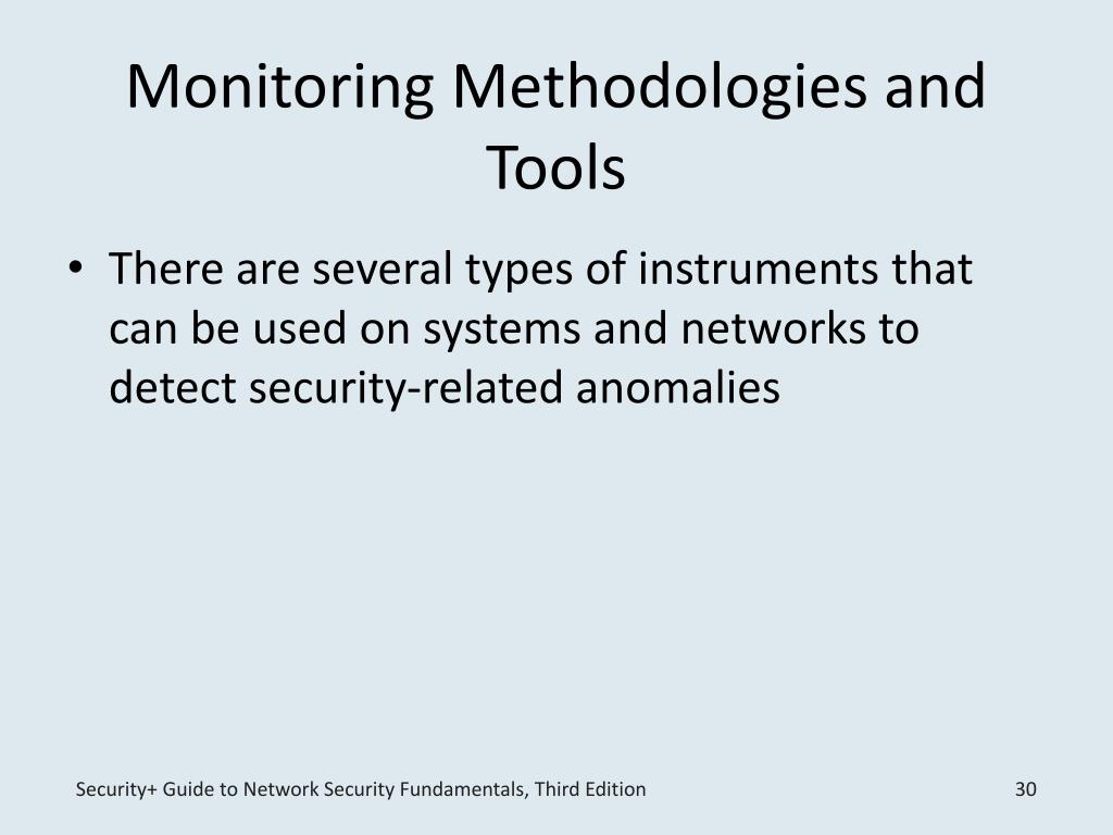 Monitoring Methodologies and Tools There are several types of instruments that can be used on systems and networks to detect security-related anomalies Security+ Guide to Network Security Fundamentals, Third Edition 30