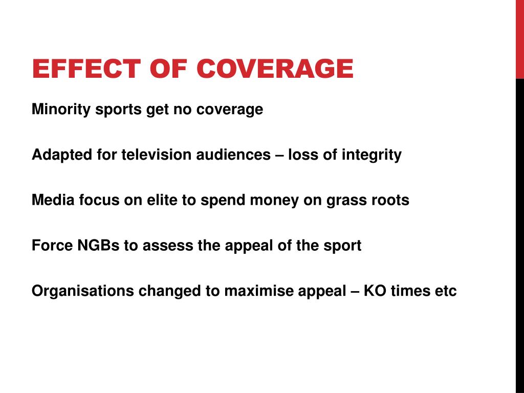 Effect of coverage • Minority sports get no coverage • Adapted for television audiences – loss of integrity • Media focus on elite to spend money on grass roots • Force NGBs to assess the appeal of the sport • Organisations changed to maximise appeal – KO times etc