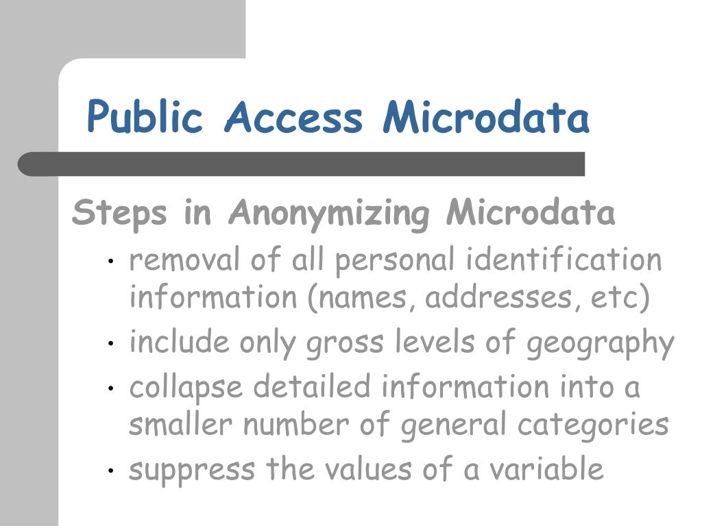Steps in Anonymizing Microdata removal of all personal identification information (names, addresses, etc) include only gross levels of geography collapse detailed information into a smaller number of general categories suppress the values of a variable Public Access Microdata