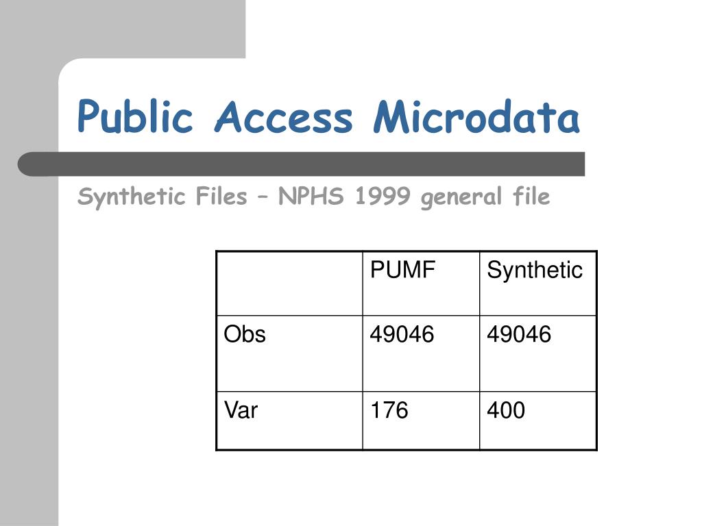Public Access Microdata Synthetic Files • These microdata do not contain actual ‘real’ cases but are pseudo-cases that provide aggregate results close to the ‘real’ cases