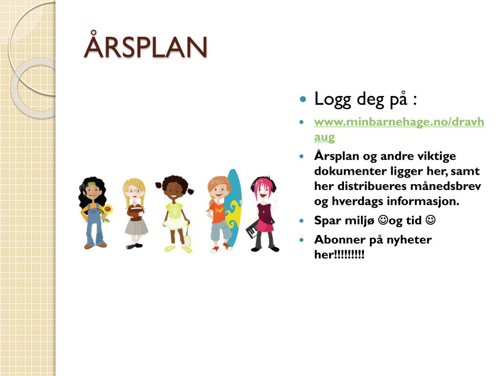 ÅRSPLAN • Logg deg på : • www.minbarnehage.no/dravhaug • Årsplan og andre viktige dokumenter ligger her, samt her distribueres månedsbrev og hverdags informasjon. • Spar miljø og tid • Abonner på nyheter her!!!!!!!!!