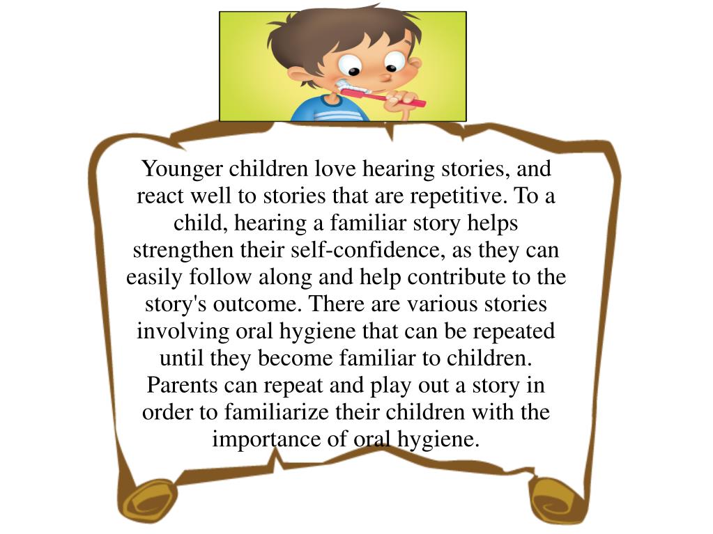 Younger children love hearing stories, and react well to stories that are repetitive. To a child, hearing a familiar story helps strengthen their self-confidence, as they can easily follow along and help contribute to the story's outcome. There are various stories involving oral hygiene that can be repeated until they become familiar to children. Parents can repeat and play out a story in order to familiarize their children with the importance of oral hygiene.