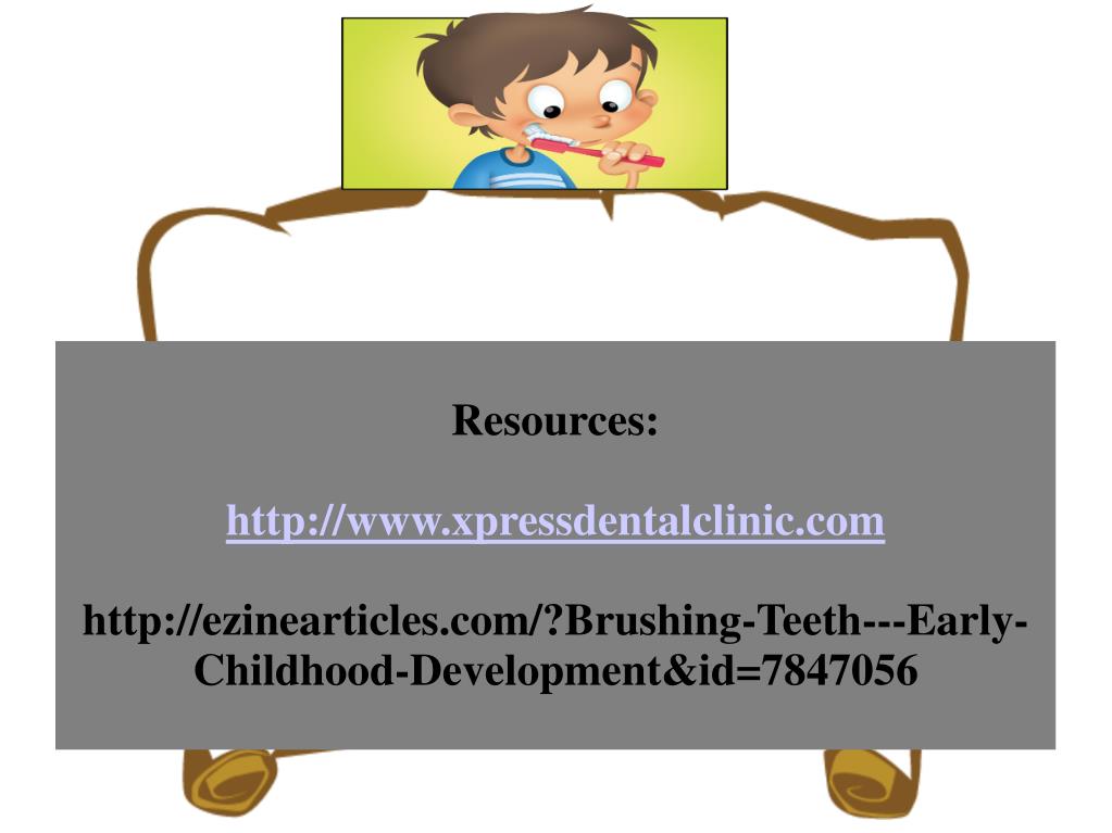 Resources: http://www.xpressdentalclinic.com http://ezinearticles.com/?Brushing-Teeth---Early-Childhood-Development&id=7847056
