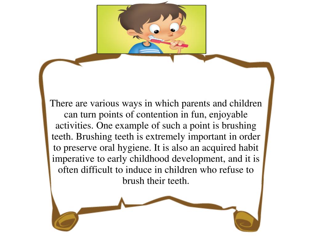 There are various ways in which parents and children can turn points of contention in fun, enjoyable activities. One example of such a point is brushing teeth. Brushing teeth is extremely important in order to preserve oral hygiene. It is also an acquired habit imperative to early childhood development, and it is often difficult to induce in children who refuse to brush their teeth.