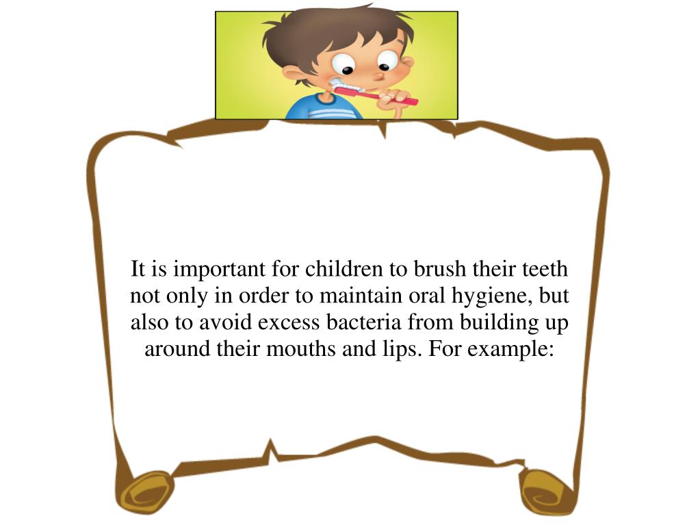 It is important for children to brush their teeth not only in order to maintain oral hygiene, but also to avoid excess bacteria from building up around their mouths and lips. For example: