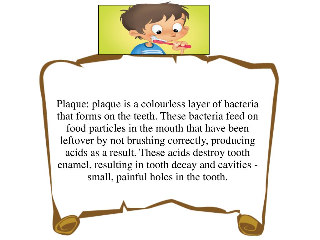 Plaque: plaque is a colourless layer of bacteria that forms on the teeth. These bacteria feed on food particles in the mouth that have been leftover by not brushing correctly, producing acids as a result. These acids destroy tooth enamel, resulting in tooth decay and cavities - small, painful holes in the tooth.