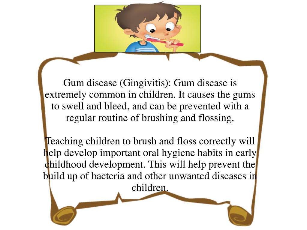 Gum disease (Gingivitis): Gum disease is extremely common in children. It causes the gums to swell and bleed, and can be prevented with a regular routine of brushing and flossing. Teaching children to brush and floss correctly will help develop important oral hygiene habits in early childhood development. This will help prevent the build up of bacteria and other unwanted diseases in children.