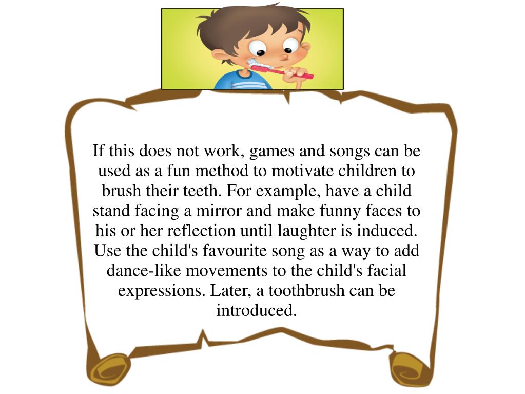 If this does not work, games and songs can be used as a fun method to motivate children to brush their teeth. For example, have a child stand facing a mirror and make funny faces to his or her reflection until laughter is induced. Use the child's favourite song as a way to add dance-like movements to the child's facial expressions. Later, a toothbrush can be introduced.