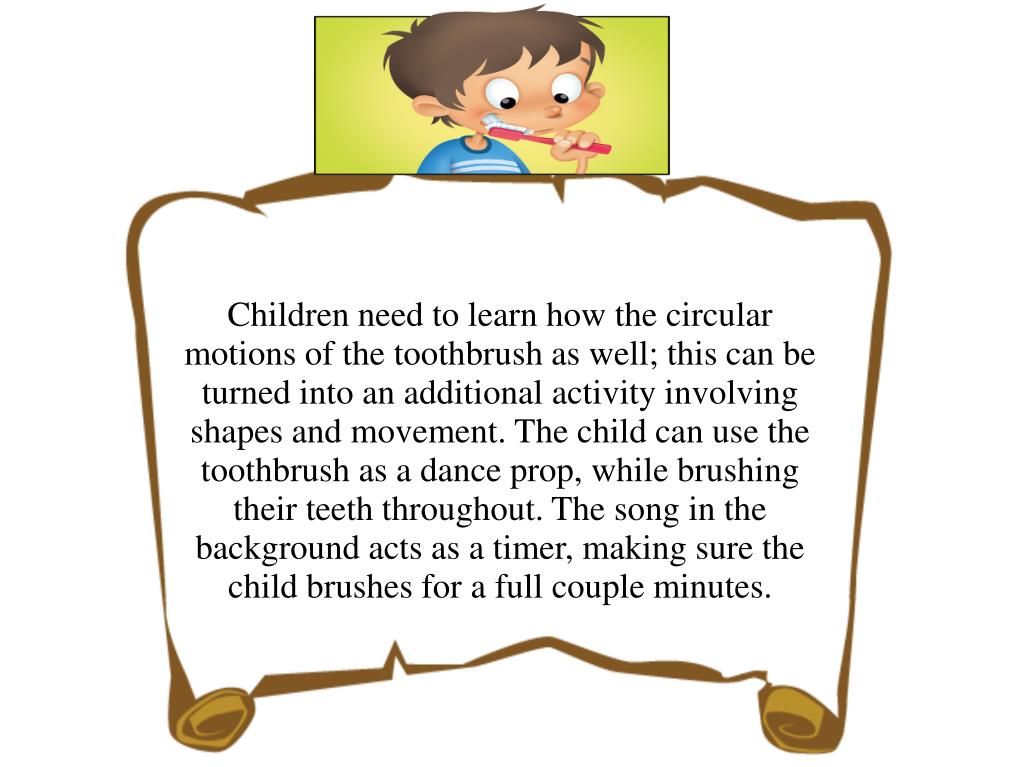 Children need to learn how the circular motions of the toothbrush as well; this can be turned into an additional activity involving shapes and movement. The child can use the toothbrush as a dance prop, while brushing their teeth throughout. The song in the background acts as a timer, making sure the child brushes for a full couple minutes.
