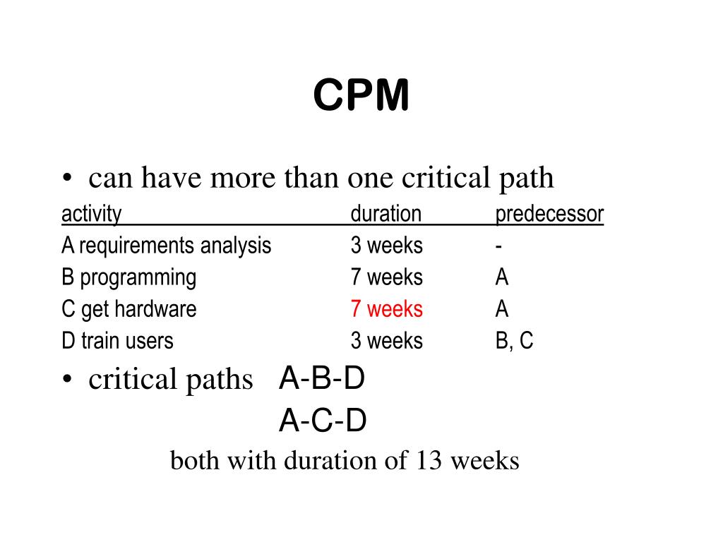 CPM • can have more than one critical path activity duration predecessor A requirements analysis 3 weeks - B programming 7 weeks A C get hardware 7 weeks A D train users 3 weeks B, C • critical paths A-B-D A-C-D both with duration of 13 weeks