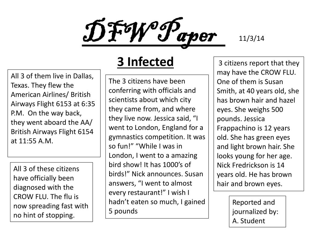 DFW Paper 11/3/14 3 Infected 3 citizens report that they may have the CROW FLU. One of them is Susan Smith, at 40 years old, she has brown hair and hazel eyes. She weighs 500 pounds. Jessica Frappachino is 12 years old. She has green eyes and light brown hair. She looks young for her age. Nick Fredrickson is 14 years old. He has brown hair and brown eyes. All 3 of them live in Dallas, Texas. They flew the American Airlines/ British Airways Flight 6153 at 6:35 P.M. On the way back, they went aboard the AA/ British Airways Flight 6154 at 11:55 A.M. The 3 citizens have been conferring with officials and scientists about which city they came from, and where they live now. Jessica said, “I went to London, England for a gymnastics competition. It was so fun!” “While I was in London, I went to a amazing bird show! It has 1000’s of birds!” Nick announces. Susan answers, “I went to almost every restaurant!” I wish I hadn’t eaten so much, I gained 5 pounds All 3 of these citizens have officially been diagnosed with the CROW FLU. The flu is now spreading fast with no hint of stopping. Reported and journalized by: A. Student
