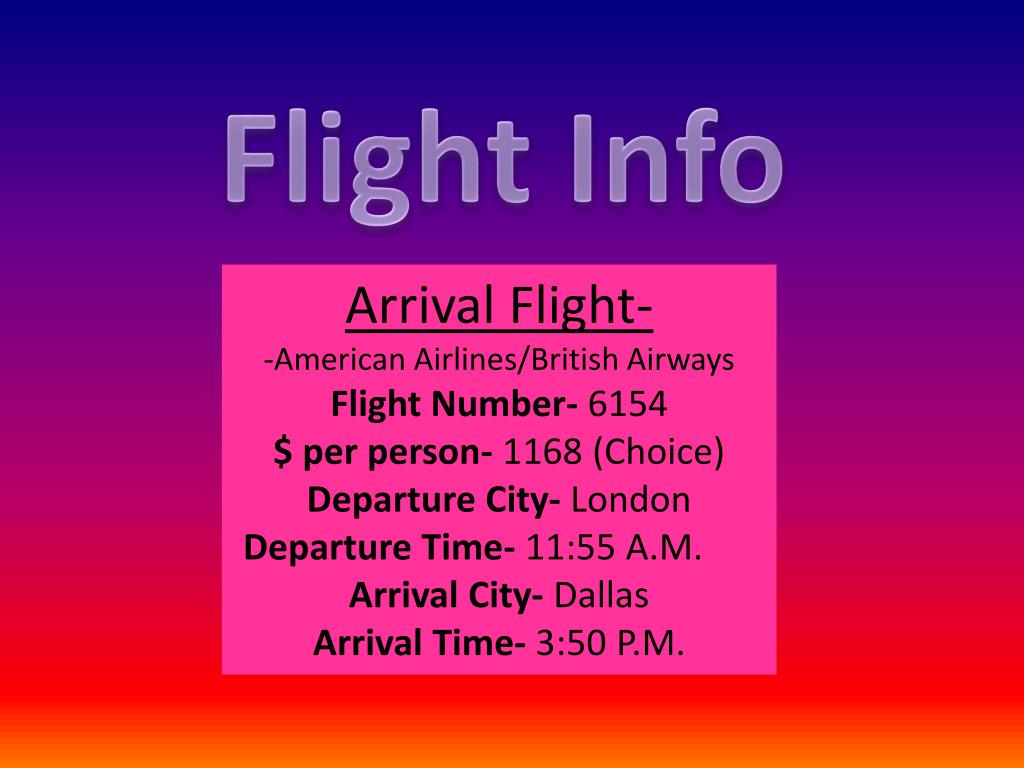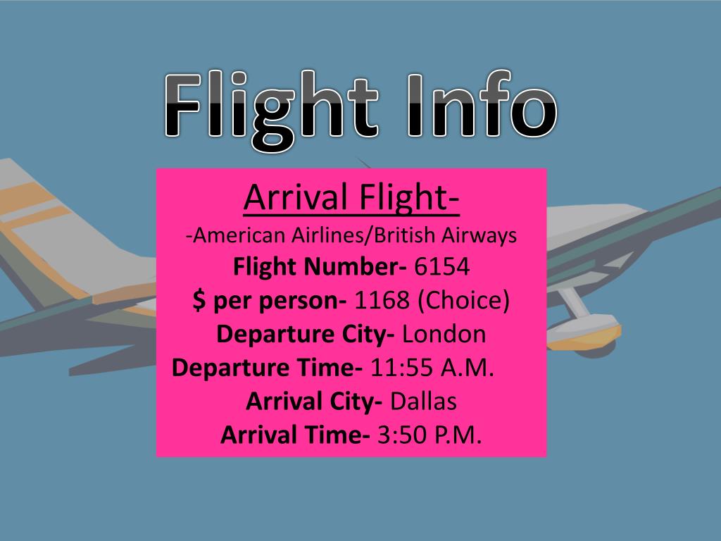 Flight Info Arrival Flight- -American Airlines/British Airways Flight Number- 6154 $ per person- 1168 (Choice) Departure City- London Departure Time- 11:55 A.M. Arrival City- Dallas Arrival Time- 3:50 P.M.
