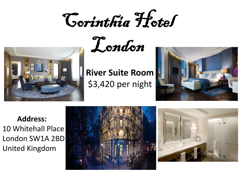 Corinthia Hotel London River Suite Room $3,420 per night Address: 10 Whitehall Place London SW1A 2BD United Kingdom