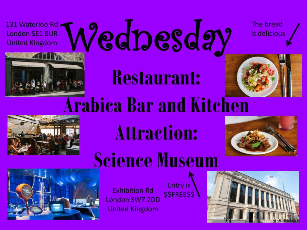 Wednesday 131 Waterloo Rd London SE1 8UR United Kingdom The bread is delicious Restaurant: Arabica Bar and Kitchen Attraction: Science Museum Entry is $$FREE$$ Exhibition Rd London SW7 2DD United Kingdom