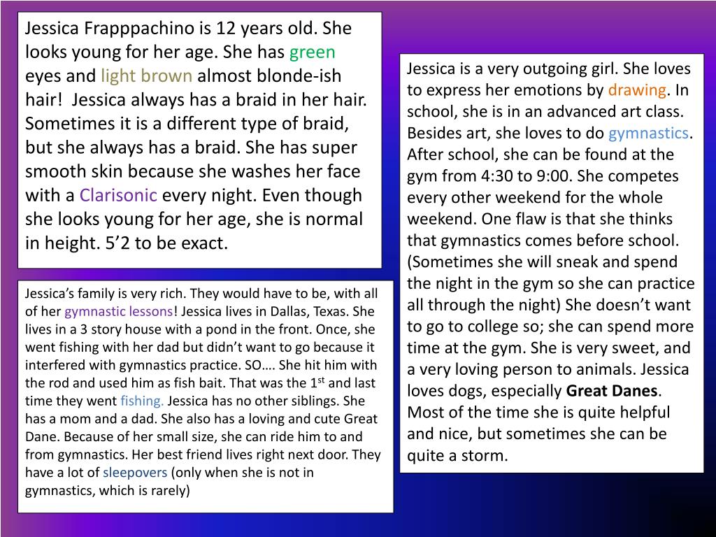 Jessica Frapppachino is 12 years old. She looks young for her age. She has green eyes and light brown almost blonde-ish hair! Jessica always has a braid in her hair. Sometimes it is a different type of braid, but she always has a braid. She has super smooth skin because she washes her face with a Clarisonic every night. Even though she looks young for her age, she is normal in height. 5’2 to be exact. Jessica is a very outgoing girl. She loves to express her emotions by drawing. In school, she is in an advanced art class. Besides art, she loves to do gymnastics. After school, she can be found at the gym from 4:30 to 9:00. She competes every other weekend for the whole weekend. One flaw is that she thinks that gymnastics comes before school. (Sometimes she will sneak and spend the night in the gym so she can practice all through the night) She doesn’t want to go to college so; she can spend more time at the gym. She is very sweet, and a very loving person to animals. Jessica loves dogs, especially Great Danes. Most of the time she is quite helpful and nice, but sometimes she can be quite a storm. Jessica’s family is very rich. They would have to be, with all of her gymnastic lessons! Jessica lives in Dallas, Texas. She lives in a 3 story house with a pond in the front. Once, she went fishing with her dad but didn’t want to go because it interfered with gymnastics practice. SO…. She hit him with the rod and used him as fish bait. That was the 1st and last time they went fishing. Jessica has no other siblings. She has a mom and a dad. She also has a loving and cute Great Dane. Because of her small size, she can ride him to and from gymnastics. Her best friend lives right next door. They have a lot ofsleepovers (only when she is not in gymnastics, which is rarely)