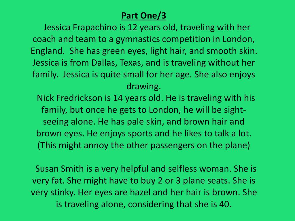 Part One/3 Jessica Frapachino is 12 years old, traveling with her coach and team to a gymnastics competition in London, England. She has green eyes, light hair, and smooth skin. Jessica is from Dallas, Texas, and is traveling without her family. Jessica is quite small for her age. She also enjoys drawing. Nick Fredrickson is 14 years old. He is traveling with his family, but once he gets to London, he will be sight-seeing alone. He has pale skin, and brown hair and brown eyes. He enjoys sports and he likes to talk a lot. (This might annoy the other passengers on the plane) Susan Smith is a very helpful and selfless woman. She is very fat. She might have to buy 2 or 3 plane seats. She is very stinky. Her eyes are hazel and her hair is brown. She is traveling alone, considering that she is 40.