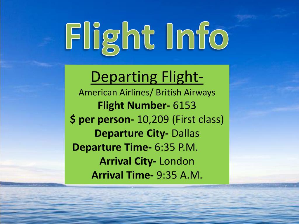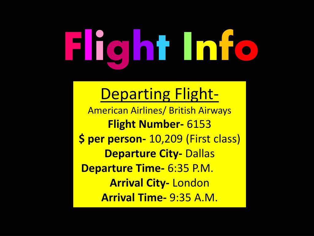 Flight Info Departing Flight- American Airlines/ British Airways Flight Number- 6153 $ per person- 10209 (First class) Departure City- Dallas Departure Time- 6:35 P.M. Arrival City- London Arrival Time- 9:35 A.M.