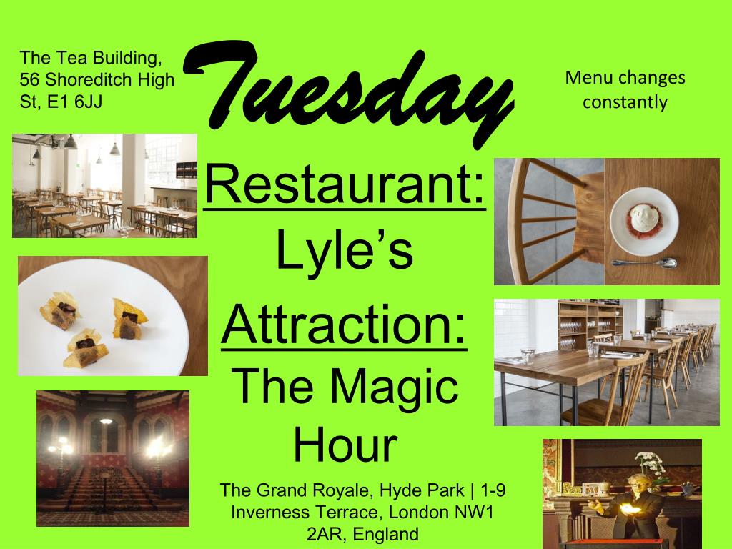 Tuesday The Tea Building, 56 Shoreditch High St, E1 6JJ Menu changes constantly Restaurant: Lyle’s Attraction: The Magic Hour The Grand Royale, Hyde Park | 1-9 Inverness Terrace, London NW1 2AR, England