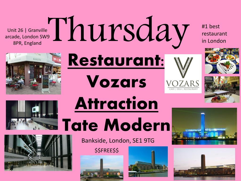 Thursday #1 best restaurant in London Unit 26 | Granville arcade, London SW9 8PR, England Restaurant: Vozars Attraction Tate Modern Bankside, London, SE1 9TG $$FREE$$