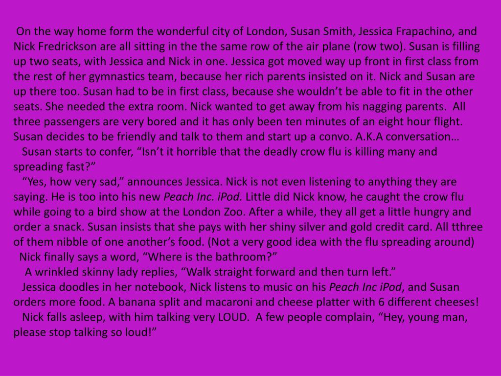 On the way home form the wonderful city of London, Susan Smith, Jessica Frapachino, and Nick Fredrickson are all sitting in the the same row of the air plane (row two). Susan is filling up two seats, with Jessica and Nick in one. Jessica got moved way up front in first class from the rest of her gymnastics team, because her rich parents insisted on it. Nick and Susan are up there too. Susan had to be in first class, because she wouldn’t be able to fit in the other seats. She needed the extra room. Nick wanted to get away from his nagging parents. All three passengers are very bored and it has only been ten minutes of an eight hour flight. Susan decides to be friendly and talk to them and start up a convo. A.K.A conversation… Susan starts to confer, “Isn’t it horrible that the deadly crow flu is killing many and spreading fast?” “Yes, how very sad,” announces Jessica. Nick is not even listening to anything they are saying. He is too into his new Peach Inc. iPod. Little did Nick know, he caught the crow flu while going to a bird show at the London Zoo. After a while, they all get a little hungry and order a snack. Susan insists that she pays with her shiny silver and gold credit card. All tthree of them nibble of one another’s food. (Not a very good idea with the flu spreading around) Nick finally says a word, “Where is the bathroom?” A wrinkled skinny lady replies, “Walk straight forward and then turn left.” Jessica doodles in her notebook, Nick listens to music on his Peach Inc iPod, and Susan orders more food. A banana split and macaroni and cheese platter with 6 different cheeses! Nick falls asleep, with him talking very LOUD. A few people complain, “Hey, young man, please stop talking so loud!”