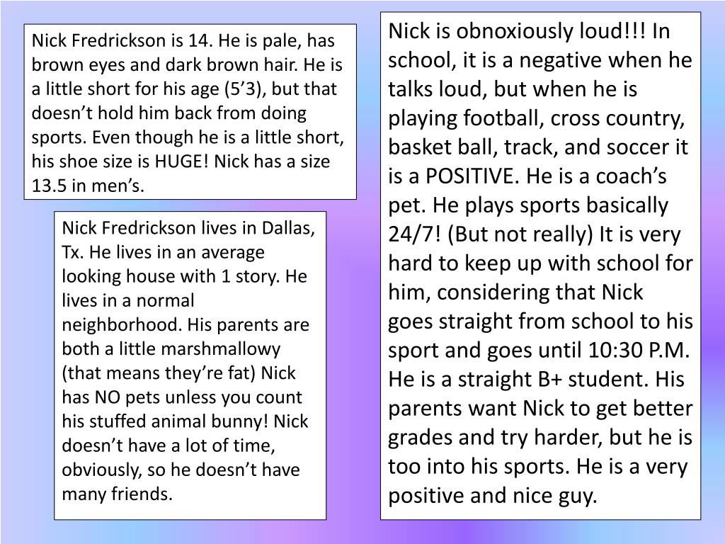 Nick is obnoxiously loud!!! In school, it is a negative when he talks loud, but when he is playing football, cross country, basket ball, track, and soccer it is a POSITIVE. He is a coach’s pet. He plays sports basically 24/7! (But not really) It is very hard to keep up with school for him, considering that Nick goes straight from school to his sport and goes until 10:30 P.M. He is a straight B+ student. His parents want Nick to get better grades and try harder, but he is too into his sports. He is a very positive and nice guy. Nick Fredrickson is 14. He is pale, has brown eyes and dark brown hair. He is a little short for his age (5’3), but that doesn’t hold him back from doing sports. Even though he is a little short, his shoe size is HUGE! Nick has a size 13.5 in men’s. Nick Fredrickson lives in Dallas, Tx. He lives in an average looking house with 1 story. He lives in a normal neighborhood. His parents are both a little marshmallowy (that means they’re fat) Nick has NO pets unless you count his stuffed animal bunny! Nick doesn’t have a lot of time, obviously, so he doesn’t have many friends.