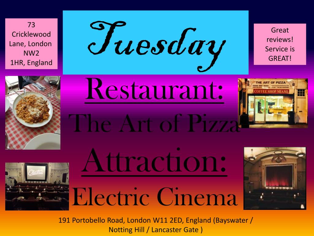 Tuesday 73 Cricklewood Lane, London NW2 1HR, England Great reviews! Service is GREAT! Restaurant: The Art of Pizza Attraction: Electric Cinema 191 Portobello Road, London W11 2ED, England (Bayswater / Notting Hill / Lancaster Gate )