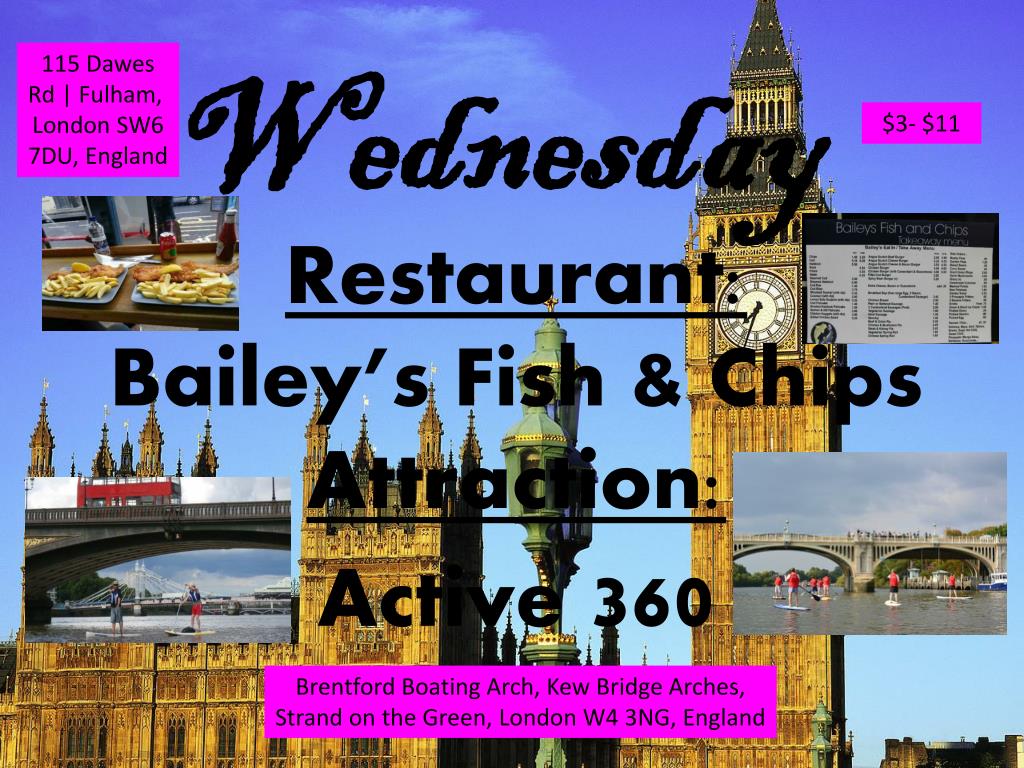 115 Dawes Rd | Fulham, London SW6 7DU, England Wednesday $3- $11 Restaurant: Bailey’s Fish & Chips Attraction: Active 360 Brentford Boating Arch, Kew Bridge Arches, Strand on the Green, London W4 3NG, England