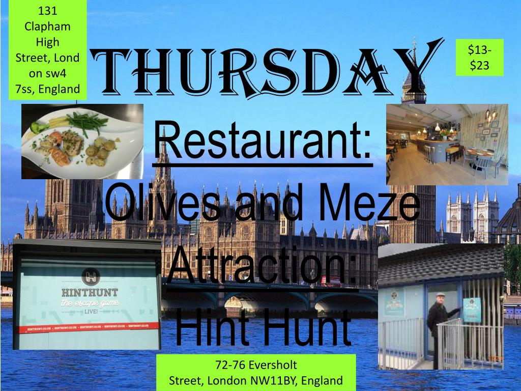131 Clapham High Street, London sw4 7ss, England Thursday $13-$23 Restaurant: Olives and Meze Attraction: Hint Hunt 72-76 Eversholt Street, London NW11BY, England