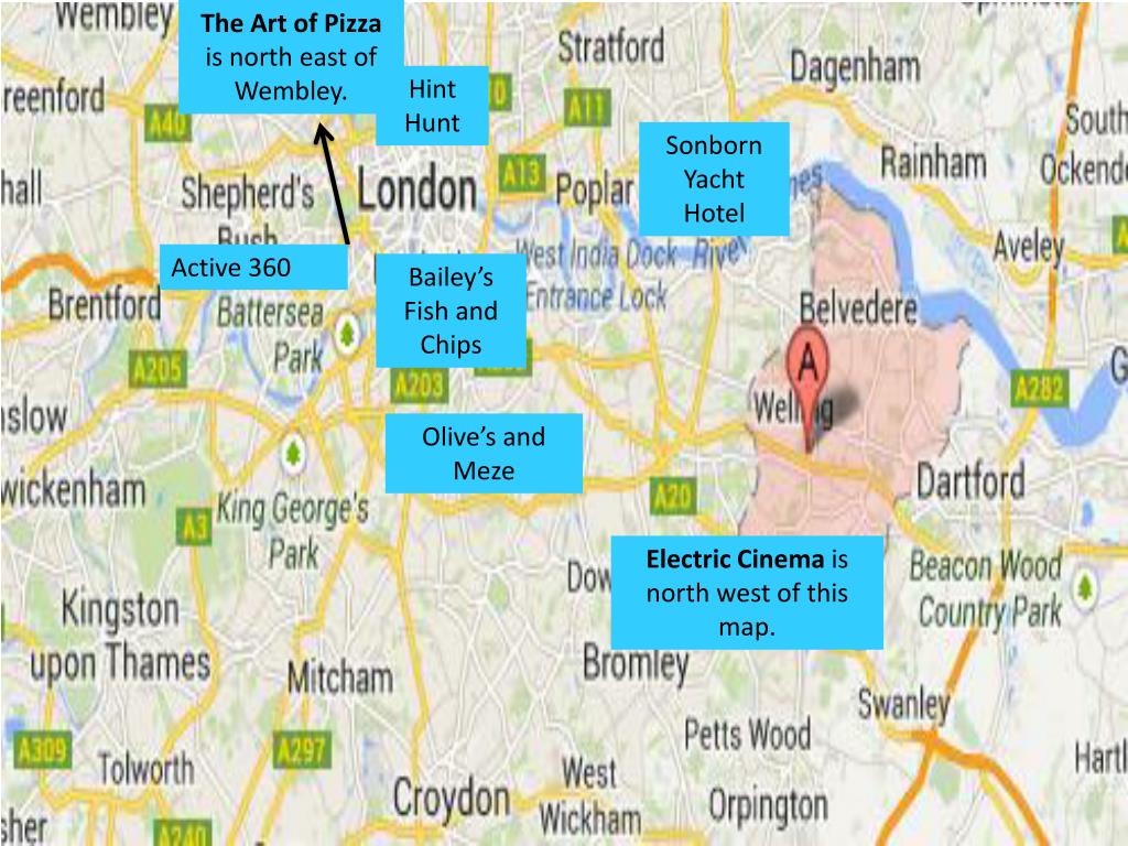 The Art of Pizza is north east of Wembley. Hint Hunt Sonborn Yacht Hotel Active 360 Bailey’s Fish and Chips Olive’s and Meze Electric Cinema is north west of this map.