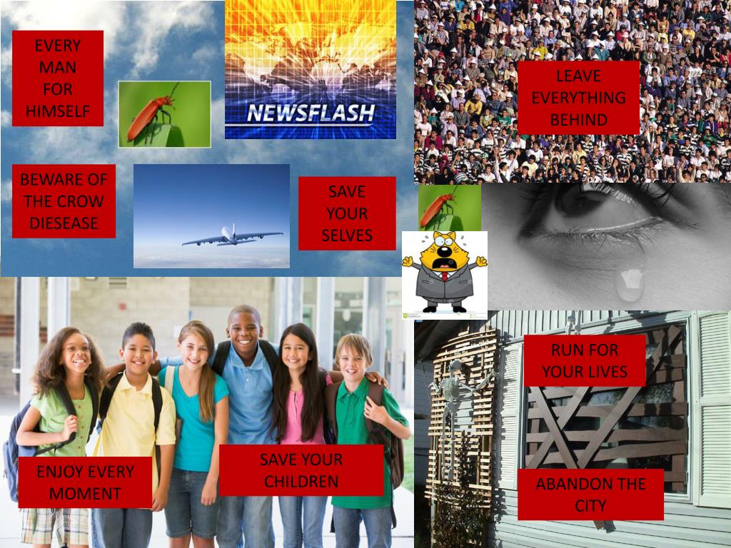 EVERY MAN FOR HIMSELF LEAVE EVERYTHING BEHIND BEWARE OF THE CROW DIESEASE SAVE YOUR SELVES RUN FOR YOUR LIVES SAVE YOUR CHILDREN ENJOY EVERY MOMENT ABANDON THE CITY