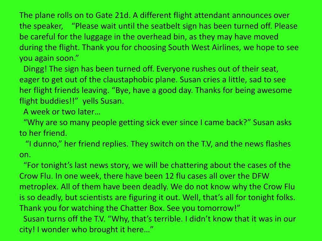 The plane rolls on to Gate 21d. A different flight attendant announces over the speaker, “Please wait until the seatbelt sign has been turned off. Please be careful for the luggage in the overhead bin, as they may have moved during the flight. Thank you for choosing South West Airlines, we hope to see you again soon.” Dingg! The sign has been turned off. Everyone rushes out of their seat, eager to get out of the claustaphobic plane. Susan cries a little, sad to see her flight friends leaving. “Bye, have a good day. Thanks for being awesome flight buddies!!” yells Susan. A week or two later… “Why are so many people getting sick ever since I came back?” Susan asks to her friend. “I dunno,” her friend replies. They switch on the T.V, and the news flashes on. “For tonight’s last news story, we will be chattering about the cases of the Crow Flu. In one week, there have been 12 flu cases all over the DFW metroplex. All of them have been deadly. We do not know why the Crow Flu is so deadly, but scientists are figuring it out. Well, that’s all for tonight folks. Thank you for watching the Chatter Box. See you tomorrow!” Susan turns off the T.V. “Why, that’s terrible. I didn’t know that it was in our city! I wonder who brought it here…”